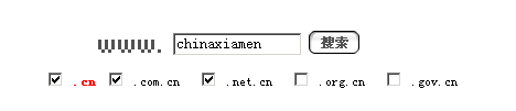 2、输入您需要查询的域名如:chinaxiamen.cn,那么请输入chinaxiamen,然后选择.cn后缀。