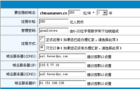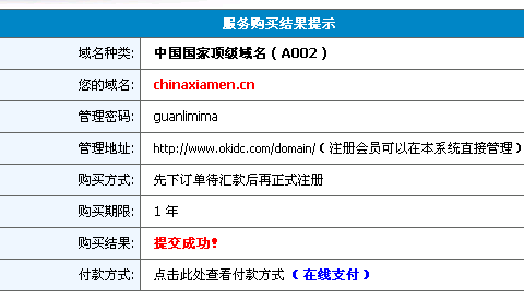此时您将看到订单提交的结果,如果您的帐户上有足够款项,并且您选择的注册方式是"正式注册",那么域名将马上注册成功并扣除注册款项,如果您选择的注册方式是"只交订单",那么域名并没有真正生效,只是提交到了我们的申请订单里,这时,您需要按"汇款方式"办理汇款,并通知我们,我们将马上为您办理后续事宜。完全不用您自己操心。